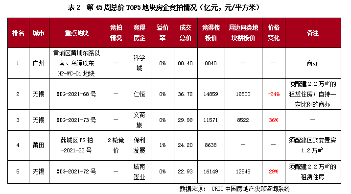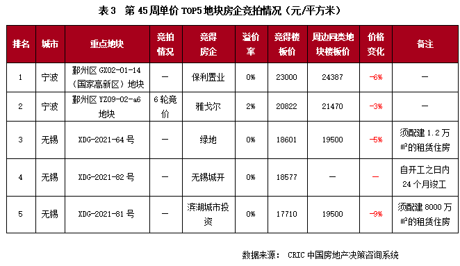 受市场热度低位运行影响,无锡、宁波新一轮集中土拍热度也明显下滑,出让地块基本均以底价成交为主,溢价成交地块比例较上一轮明显减少。如宁波成交的28宗涉宅用地中,仅有1宗普通商品宅地和2宗保障宅地低溢价成交;无锡三批次20宗宅地也仅有3宗溢价成交。在此影响下,本周成交总价TOP5和单价TOP5的入榜地块仍以底价成交为主。