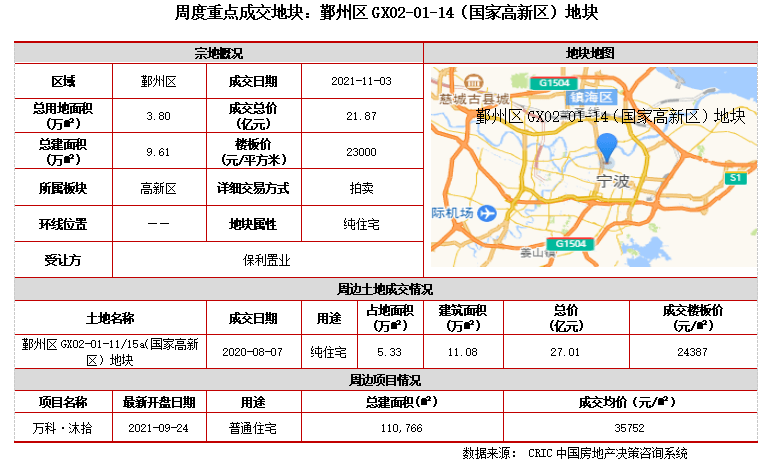 28宗成交地块中,单价最高的地块为鄞州区GX02-01-14(国家高新区)地块,成交楼板价达23000元/平方米,由保利置业底价竞得。据地理位置来看,宗地位置较为优越,路网交织,500米内还在建有地铁站点,交通通达性较强。周边生活与教育配套也十分完善,方圆两公里内有会展中心、港隆时代广场、宁波国家高新区第一幼儿园、宁波市国家高新区实验学校等配套。周边楼市方面,目前地块周边两公里内有多个项目在售,临近项目的销售限价与该项目销售限价基本一致,最新成交均价约36000元/平方米,不过此次成交地块的拿地价格相对略低,盈利空间相对更为充裕。