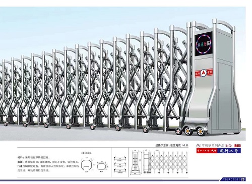 电动伸缩门是近年来兴起的工业产品,工艺复杂,产品体积大,制作周期长,表面经过特殊电泳技术精密处理,不锈钢表面光泽无限,不易粘附灰尘和土壤等空气粒子,不会被污染气体腐蚀,不会生锈