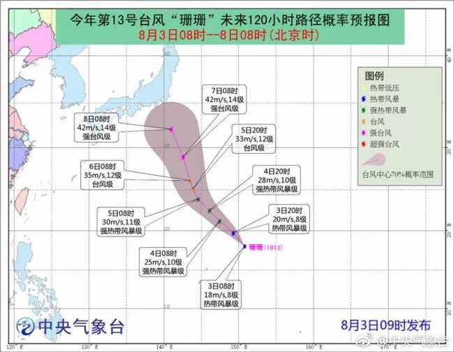 今年第13号台风“珊珊”(热带风暴级,8级, 18米/秒)已于今天8时在日本东京南偏东方向约2250公里的太平洋上生成(北纬18.0度、东经150.8度)。