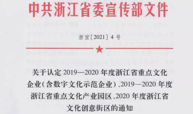 近日,浙江省委宣传部发布《关于认定2019-2020年度浙江省重点文化企业(含数字文化示范企业)、2019-2020年度浙江省重点文化产业园区、2020年度浙江省文化创意街区的通知》。