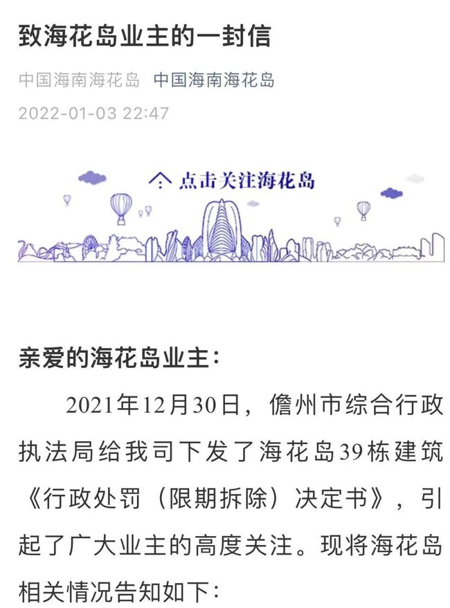 2021年12月30日,儋州市综合行政执法局给我司下发了海花岛39栋建筑《行政处罚(限期拆除)决定书》,引起了广大业主的高度关注。现将海花岛相关情况告知如下: