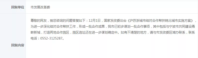 国家发改委网站发布了《沪苏浙城市结对合作帮扶皖北城市实施方案》蚌埠将于宁波牵手共建产业园目前情况如何了呢?有网友咨询了蚌埠市发改委