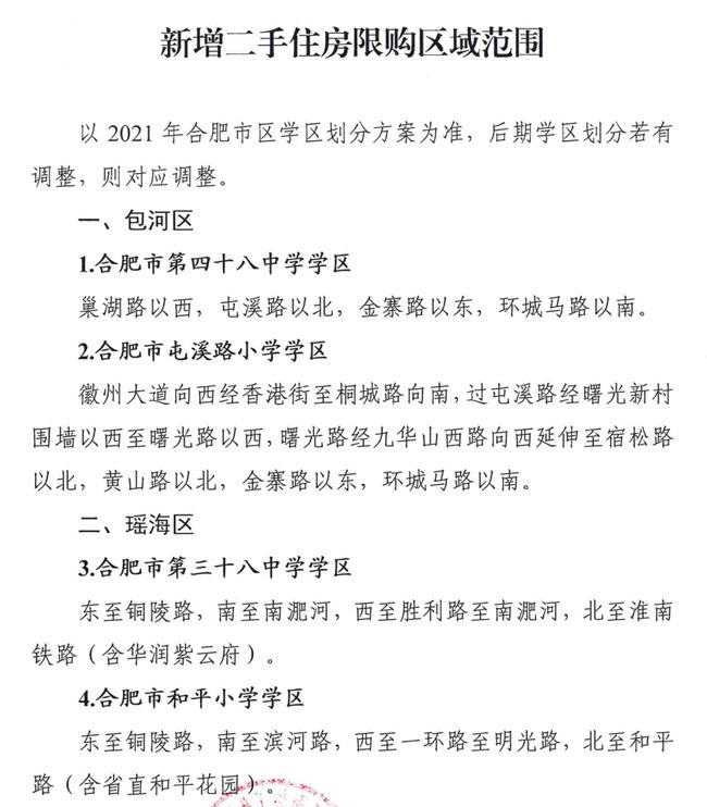 今天的政策,应该是对4月份限购范围中提到的“其他区域指定学校的学区范围”进行落实,这些区域包括包河区的合肥市第48中中学学区、合肥市屯溪路小学学区,瑶海区的合肥市第38中学学区、合肥市和平小学学区。