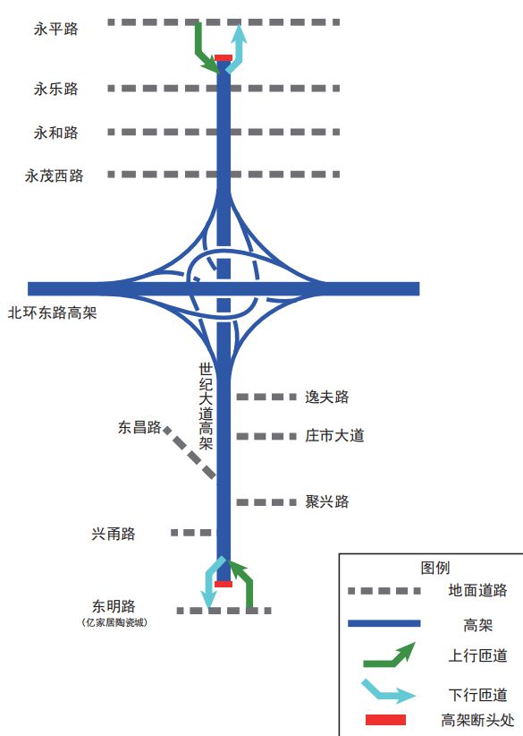 全线设置世纪大道-北外环互通立交1座,上下匝道2对——分别位于东明路、永平路。