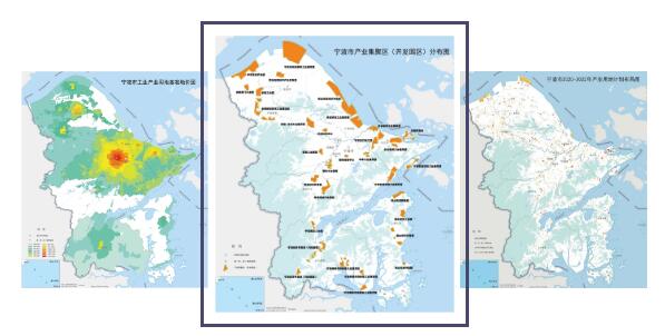 △ 从左往右依次为“宁波工业产业用地基准地价图”、“宁波市产业集聚区分布图”、“宁波2020-2022产业用地计划布局图”。