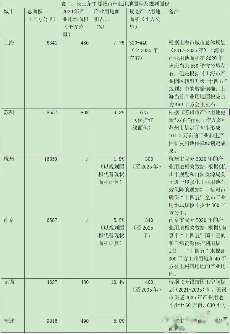 从产业用地规模上看,上述代表城市的产业用地规模和发展策略有所不同,其中2020年的产业用地面积及规划的产业用地面积表二。