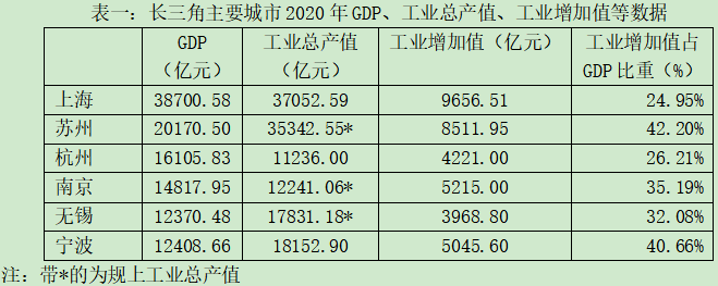从规模来看,尽管2021年苏州工业总产值以过四万亿的规模超过了上海,但是在2020年上海仍然是长三角工业总产值的龙头,沪苏两城在工业规模上近几年一直处于这种互有胜负、你追我敢的态势。但是从工业增加值占GDP的比重看,苏州市在2020年以42.2%的比例一骑绝尘。同时宁波以40.66%的比重紧随其后,作为浙江第一工业强市,展示出了工业经济发展的韧性。