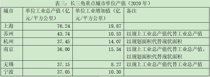 总体来看长三角重要城市的单位工业总产值的水平相当,多数城市在36亿元/平方公里左右,这证明了长三角重要城市的产业能级相似。除了上海和苏州这两个亩产论英雄的“优等生”外,其他重要城市都需要找到适合自身的亩产提升办法,找准自身问题,争取跳出36亿元/平方公里的大部队。
