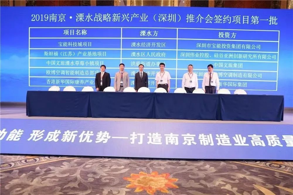 2019年8月28日,南京市溧水区人民政府在深圳举办战略新兴产业推介会,围绕“培育新动能,形成新优势——打造南京制造业高质量发展高地”主题,对溧水区位优势、投资环境、发展前景,以及科技人才、总部经济招商政策等进行了全方位推介。14个重大项目在会上集中签约,投资总额达394.8亿元。