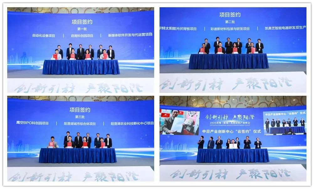会议上,启南科创园项目、自动化设备项目、新媒体软件开发与代运营项目、彩迪新材料包装与研发项目、佳尔特太阳能光伏背板项目、凯美艺智能电器研发及生产项目、阳澄湖城市综合体项目、鹰空BPO科创园项目、阳澄湖农业科技孵化中心项目等9个项目签约,总投资达18.8亿元!此外,中日产业创新中心在会议上进行了“云签约”。