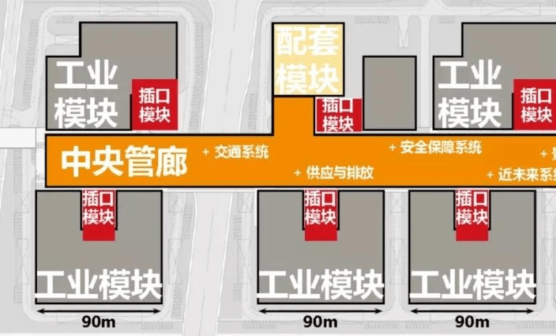 设计以工业需求为主导,合理收纳工业界面,创造性地提出“中央甲板”概念,模块化工业产业单元和插口模块,灵活组合在甲板两侧。甲板作为兼顾功能、效率与环境的重点核心空间,是对传统综合管廊的功能拓展、技术革新和模式创新。插口模块综合货运提升、管线上楼、设备安置等多种功能,是实现物流垂直化、衔接空中甲板与产业终端的重要功能节点。