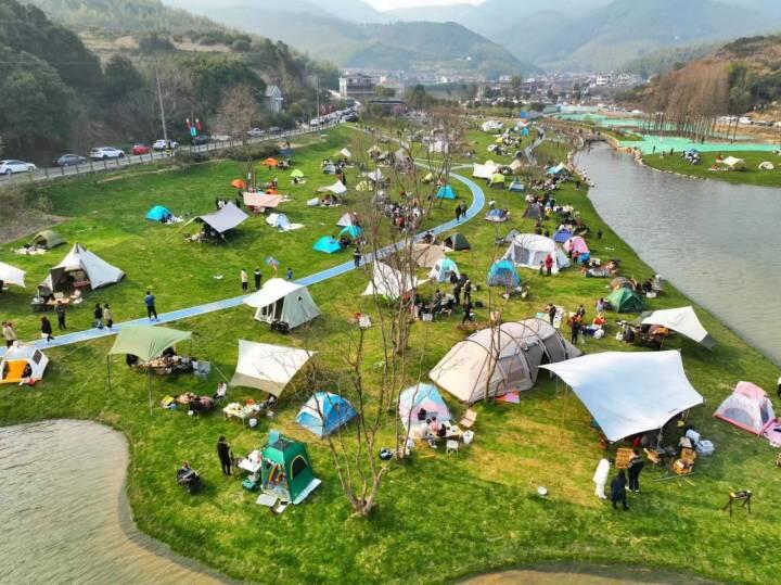 一个天气晴好的周末。镇海区九龙湖镇秦山村草坪湿地公园里,散布着一顶顶帐篷,游客闲坐在草地上,近旁就是一汪碧蓝清澈的湖水。据了解,秦山湿地公园建成后,秦山村客流量增长近60%,周末日均游客量近2000人。不仅如此,湿地公园还带动了周边农家乐、民宿的经营,“草坪经济”红利初显。在九龙湖镇另一个“网红村”横溪村,全国首家石墨烯应用帐篷营地——珞桐艺术帐篷营地,同样受到不少游客的青睐。