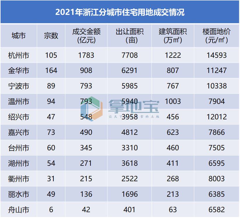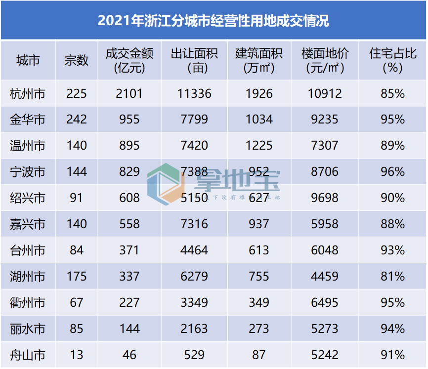 2.统计范围:浙江省各地市成交经营性用地(经营性用地包括住宅、商业、办公等用地,统计住宅不包含公租房、安置房、人才房等);